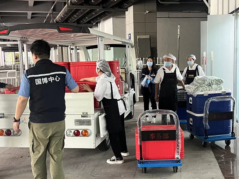 國博經(jīng)營公司后勤管理部負責本屆展會的供餐、餐區(qū)布置及美化工作,從現(xiàn)場供餐布局到出餐情況的把控,包括菜料清洗、切配、餐食制作、菜品打包、裝箱以及配送等,不放過每一個細節(jié),每一個環(huán)節(jié)落實到具體負責人,嚴格把控。