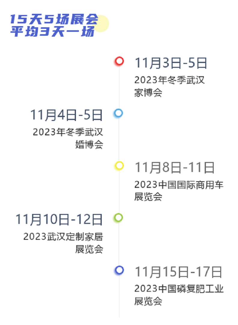 11月15日,2023中國(guó)磷復(fù)肥工業(yè)展覽會(huì)在武漢國(guó)際博覽中心拉開(kāi)帷幕,兩周內(nèi)先后有5場(chǎng)行業(yè)展覽在國(guó)博中心舉辦,平均每3天承辦1場(chǎng)展會(huì)。