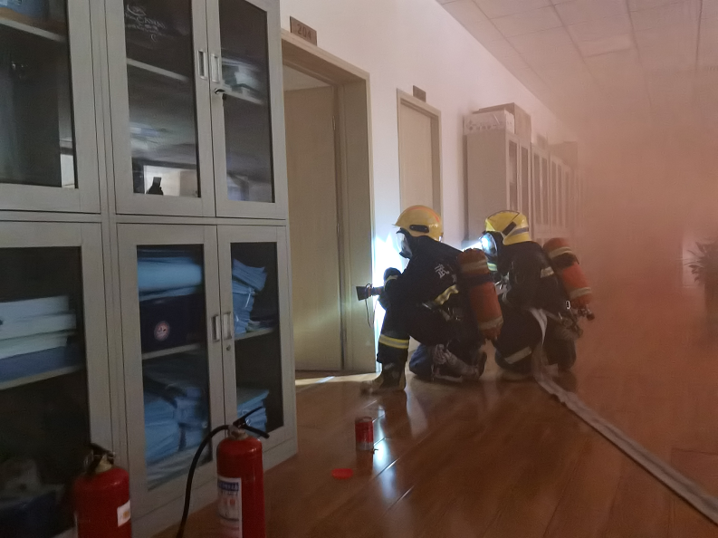 本次演練模擬公司辦公區(qū)一處用電設備因短路引發(fā)設備及周邊物品燃燒,現(xiàn)場濃煙較大并向外擴散。現(xiàn)場辦公人員發(fā)現(xiàn)火情后立即向公司應急工作辦公室匯報,隨后立即啟動應急預案。在組織人員疏散,撲救初期火災的同時撥打消防報警電話。國博消防救援站到達現(xiàn)場后成功將火災撲救。