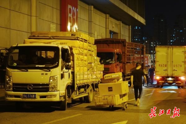 場館外排隊(duì)等待進(jìn)入的大貨車。